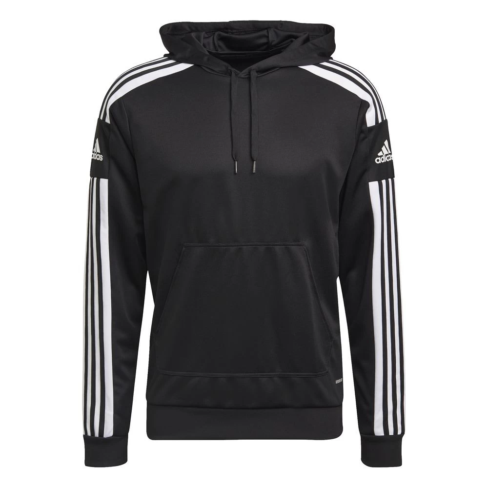 Adidas Fußball Squadra 21 Trainingsanzug für Herren. Trainingsanzug bestehend aus Hoodie sowie Trainingshose. Hoodie: Seht wie ein Team aus. Zeigt Teamstärke. Der adidas Squadra 21 Hoodie sieht allein gut aus, aber noch besser, wenn dein Team ihn auch trägt. Das weiche Material sorgt für ein angenehmes Tragegefühl, während die feuchtigkeitsabsorbierende AEROREADY Technologie beim Fußballtraining und im Alltag trockenen Komfort garantiert. Bündchen und Saum gerippt. Primegreen. Kapuze mit weitenregulierbarem Kordelzug. Feuchtigkeitsabsorbierend. Kängurutasche. Material: 100% recycelter Polyester (Doppelstrick). Farbe: schwarz/weiß. Trainingshose: Diese Fußballhose kommt mit feuchtigkeitsabsorbierender AEROREADY Technologie für ein warmes und trockenes Tragegefühl. Außerdem ermöglicht die schmale Passform eine ungestörte Beinarbeit. Primegreen. Elastischer Bund mit Kordelzug. Reißverschlusstaschen auf der Vorderseite. Rippdetails im Wadenbereich; Reißverschlüsse im Knöchelbereich. Material: 100% recycelter Polyester (Doppelstrick). Farbe: schwarz/weiß.