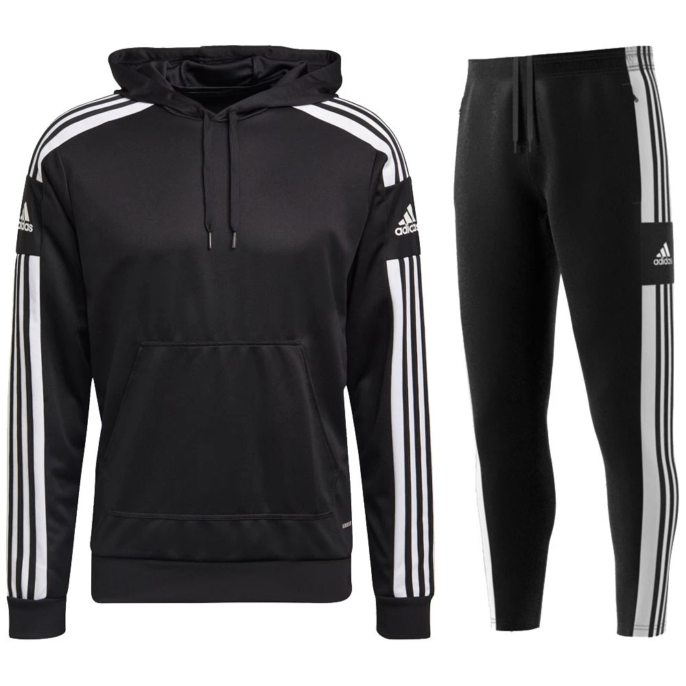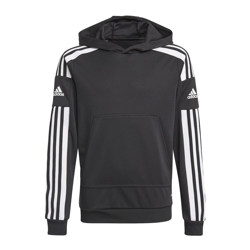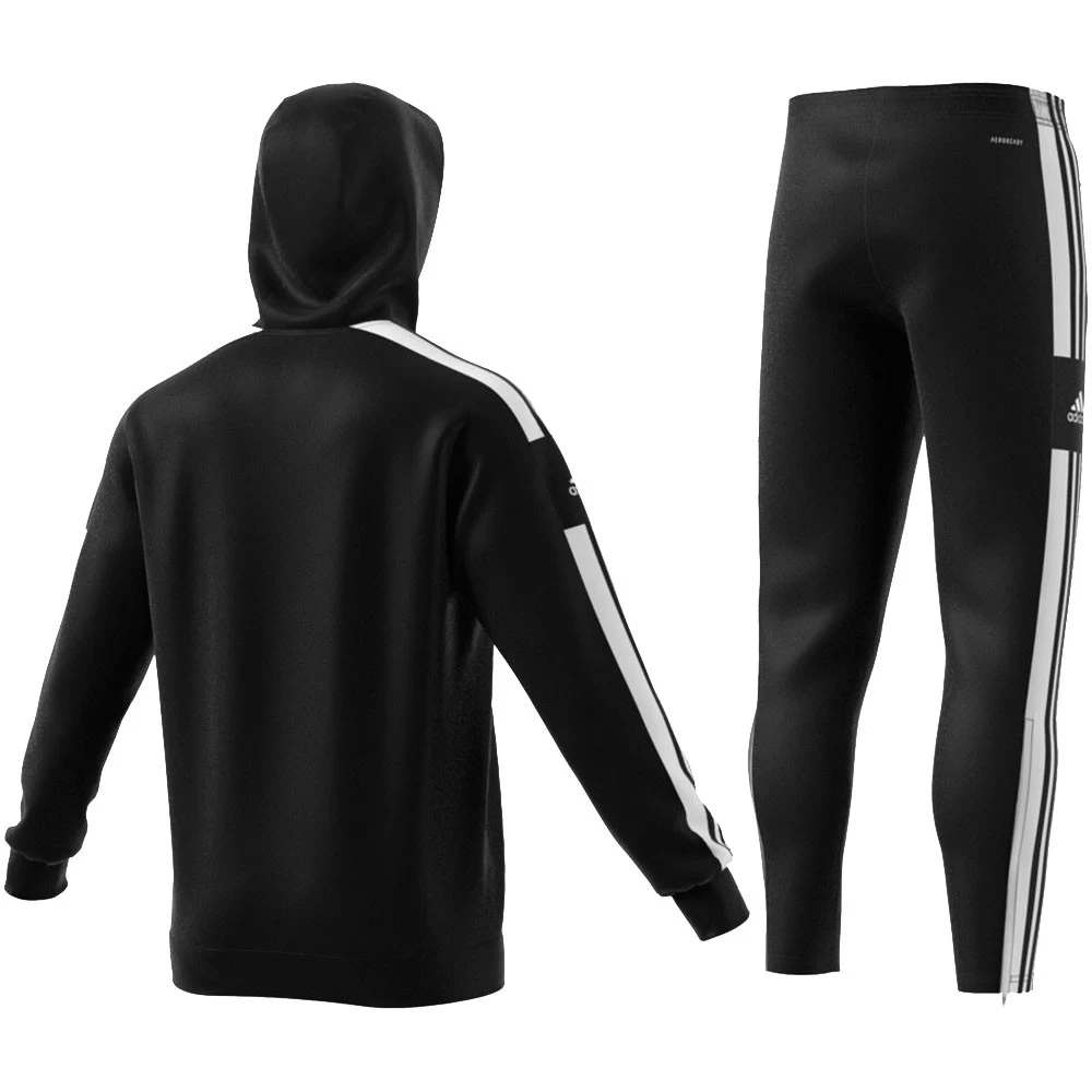 Adidas Fußball Squadra 21 Trainingsanzug in Kindergrößen. Trainingsanzug bestehend aus Hoodie sowie Trainingshose. Hoodie: Seht wie ein Team aus. Zeigt Teamstärke. Der adidas Squadra 21 Hoodie sieht allein gut aus, aber noch besser, wenn dein Team ihn auch trägt. Das weiche Material sorgt für ein angenehmes Tragegefühl, während die feuchtigkeitsabsorbierende AEROREADY Technologie beim Fußballtraining und im Alltag trockenen Komfort garantiert. Bündchen und Saum gerippt. Primegreen. Kapuze mit weitenregulierbarem Kordelzug. Feuchtigkeitsabsorbierend. Kängurutasche. Material: 100% recycelter Polyester (Doppelstrick). Farbe: schwarz/weiß. Trainingshose: Diese Fußballhose kommt mit feuchtigkeitsabsorbierender AEROREADY Technologie für ein warmes und trockenes Tragegefühl. Außerdem ermöglicht die schmale Passform eine ungestörte Beinarbeit. Primegreen. Elastischer Bund mit Kordelzug. Reißverschlusstaschen auf der Vorderseite. Rippdetails im Wadenbereich; Reißverschlüsse im Knöchelbereich. Material: 100% recycelter Polyester (Doppelstrick). Farbe: schwarz/weiß.