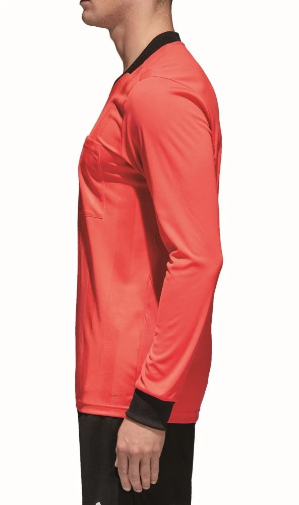 Adidas Fußball Referee 18 Herren Schiedsrichtertrikot, langarm. Leitet den Schweiß weg von deiner Haut, damit du auf jedem Schritt deines Weges trocken bleibst. Schwitze, aber mach dir nichts draus. Aufgesetzte Brusttaschen. Gerippter V-Ausschnitt. Besonders verarbeitetes Material für einen perfekten Sitz auch bei Bewegungen. Ton in Ton gehaltene Streifen, adidas Logo auf der Brust. Material: 100% Polyester. Farbe: rot/schwarz.