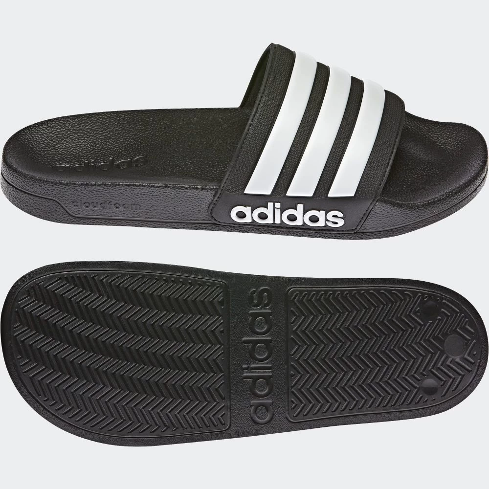 Adidas Herren Adilette Shower Badeschuhe. Reinschlüpfen und los! Mit diesen Badeschlappen bist du stylish unterwegs. Sie kombinieren den typischen 3-Streifen Style mit einer bequemen, einteiligen Cloudfoam Sohle, die Zwischensohle und Außensohle in einem ist. Der Schriftzug an der Seite sorgt außerdem für einen echten Eyecatcher. Einteiliger Synthetikriemen. Kontrastierende 3-Streifen. Bequeme, einteilige Cloudfoam Sohle. Material: Synthetik. Farbe: schwarz/weiß.