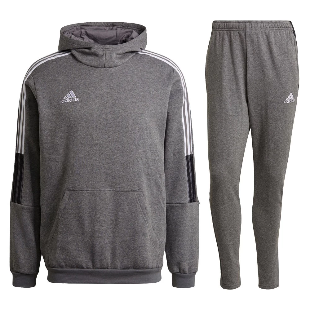 Adidas Fußball Tiro 21 Sweatanzug für Herren. Sweatanzug bestehend aus Hoodie sowie Hose. Hoodie: Jetzt sind Cool-down und Relaxen angesagt. Dieser adidas Hoodie ist ideal für die ruhigeren Momente des Fußballs, z. B. beim Dehnen vor dem Spiel oder auf dem Heimweg nach dem Training. Das Design aus Baumwollmix fühlt sich angenehm weich an. Die große Kapuze ist besonders bequem. Dreiteilige Kapuze. Kängurutaschen. Bündchen und Saum gerippt. Material: 70% Baumwolle, 30% recycelter Polyester (Fleece). Farbe: grau/weiß. Hose: Diese adidas Jogginghose ist ideal für die ruhigeren Momente des Fußballs, z. B. beim Dehnen vor dem Spiel oder auf dem Heimweg nach dem Training. Das Design aus Baumwollmix fühlt sich angenehm weich an. Dank der Reißverschlusstaschen hast du wichtige Kleinigkeiten immer griffbereit. Elastischer Bund mit Kordelzug. In die Seitennaht eingearbeitete Reißverschlusstaschen. Material: 70% Baumwolle, 30% recycelter Polyester (Fleece). Farbe: grau/weiß.