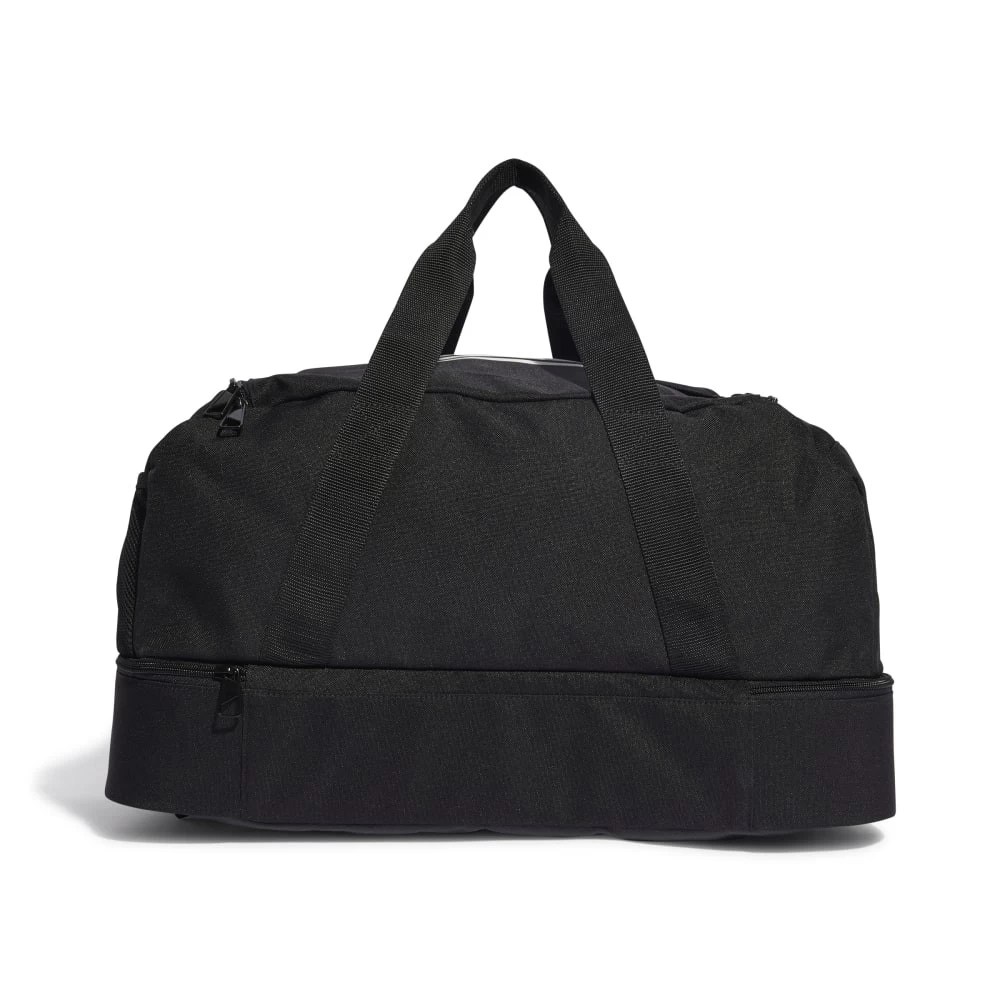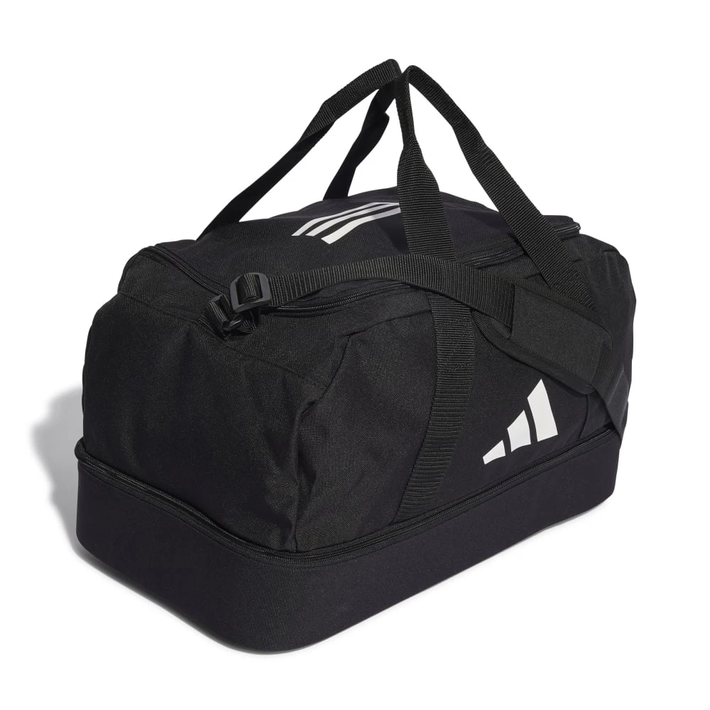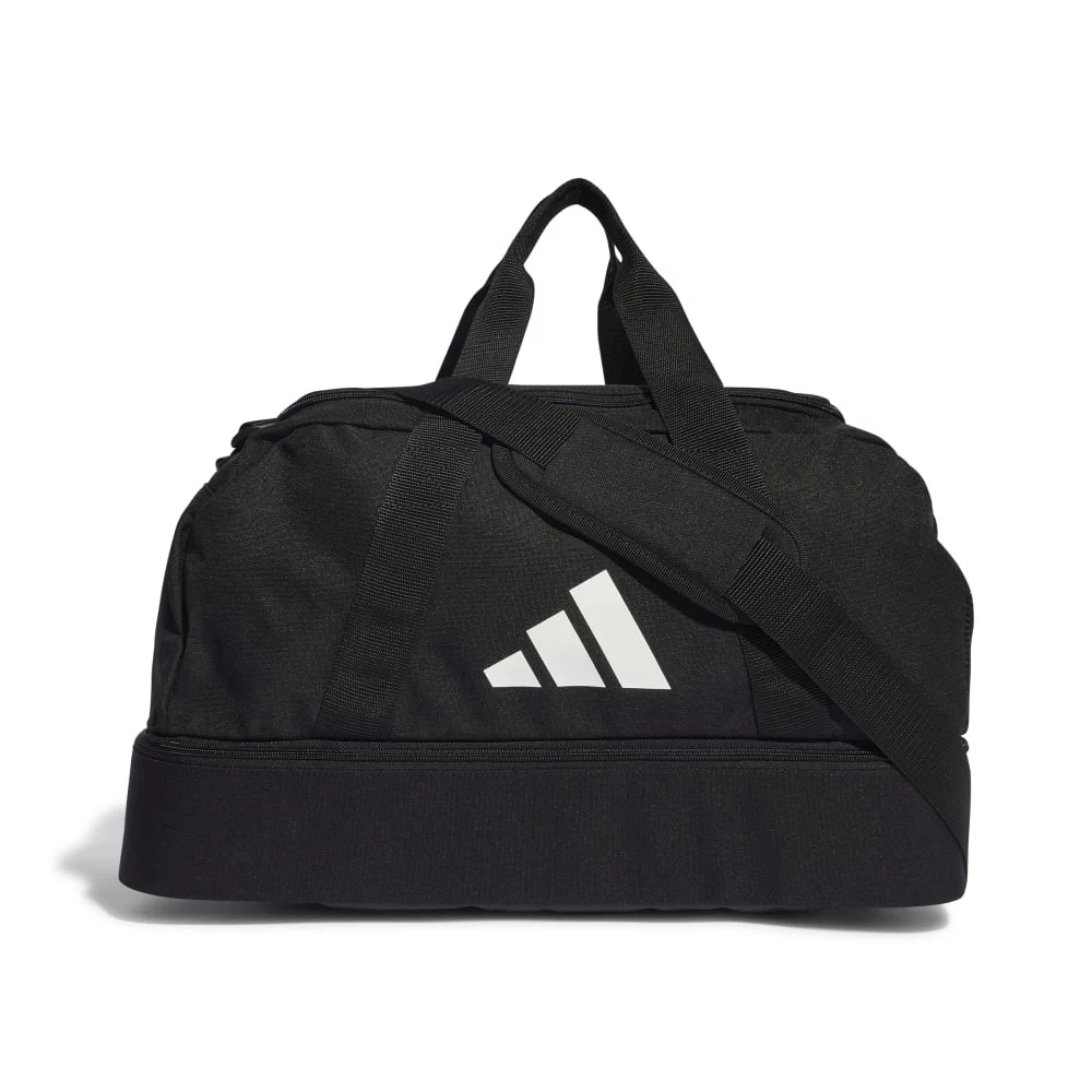 Adidas Fußball Tiro League Duffelbag mit Bodenfach S. Eine kleine Duffelbag mit recycelten Materialien. Diese adidas Tiro League Duffelbag ist perfekt für deine Fußballausrüstung. Sie hat ein strapazierfähiges Hartschalen-Bodenfach und eine seitliche Mesh-Tasche für Snacks und Wasserflasche. Dank des gepolsterten, verstellbaren Schulterriemens lässt sie sich außerdem bequem tragen. Und wenn du es eilig hast, kannst du sie dir schnell mit den Tragegriffen schnappen. Das Produkt ist Teil unseres Engagements gegen Plastikmüll und hat einen Recycling-Anteil von mindestens 40 %. Maße: 28 cm x 48 cm x 27 cm. Volumen: 30,75 l. Hartschalenfach am Boden. Mesh-Tasche an der Seite. Gepolsterter, verstellbarer Schulterriemen. Zwei Tragegriffe. Material: 100% Polyester. Farbe: schwarz/weiß.