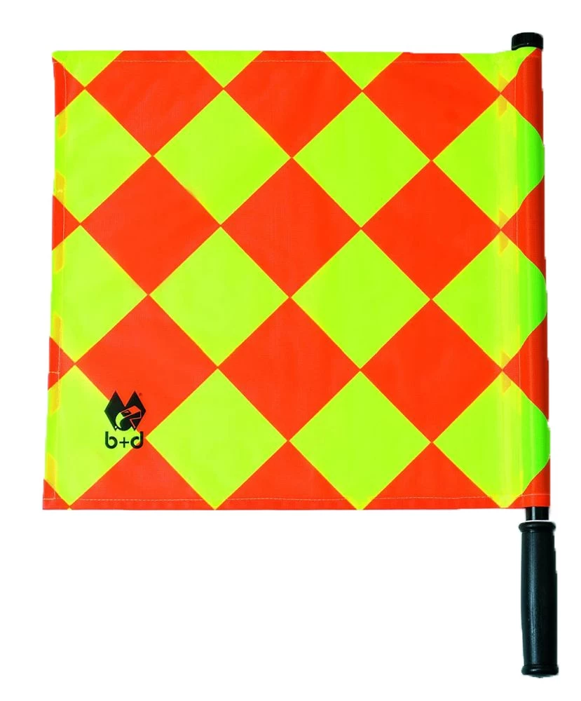 B+D Fußball Linienrichterfahne Tuch b+d Quadro I. Die meistverkaufte Fahne mit dem berühmten Drehelement. Kein Verwickeln der Flagge mehr, die sich jetzt jeder Schwenkbewegung anpasst. Dafür sorgt auch das in das Tuch eingearbeitete Gewichtsband. Leichter Kunststoffstab mit neuem, handgerechtem Soft-Grip. Leuchtfarbenes, gelb/rotes Rautenmuster. Ein Stück bedeutet hier EINE Fahne. Wenn Sie ein Set möchten, bestellen Sie bitte ZWEI Fahnen. Ca. 40 x 40 cm. Material: Polyester. Farbe: gelb/rot.