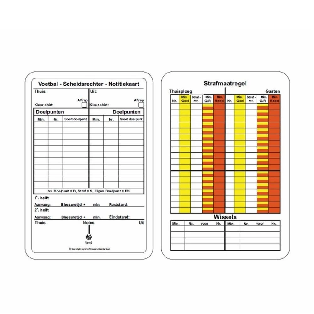 B+D Fußball Schiedsrichter Spielnotizkarten Niederländisch 50 Stk. Unverzichtbar für eine sichere Spielleitung. Beidseitig vorgedruckter Schreibkarton mit speziell abgerundeten Ecken. Ohne jede Unterlage beschreibbar, 12 x 8 cm. 50 St. Material: Karton. Farbe: weiß.