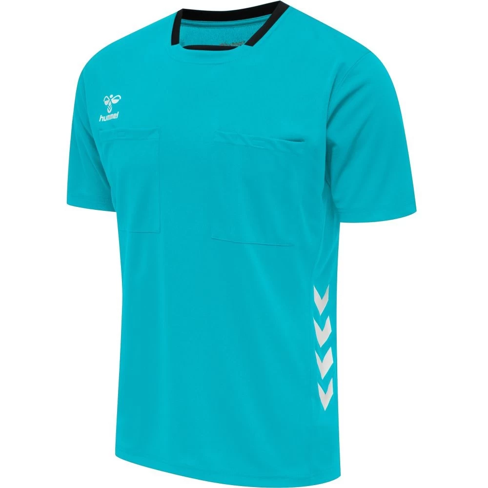 Hummel Fußball Schiedsrichter Chevron Trikot für Herren. Schiedsrichtertrikot aus Jerseystoff. Brusttasche mit Klettverschluss. Aufgedruckte Winkel und hummel-Logo. Material: 100% Polyester. Farbe: türkis.