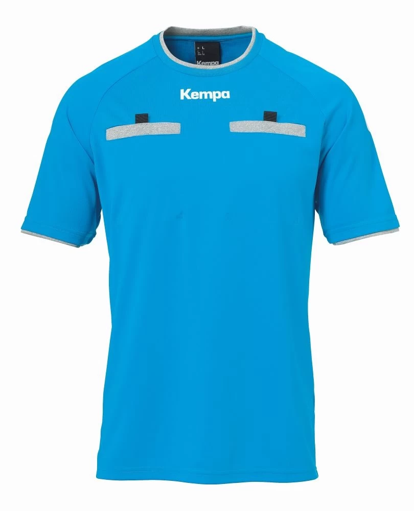 Kempa Handball Schiedsrichter Trikot Herren Kinder. Rundhalsausschnitt und Ärmelöffnung mit Kontrastbündchen. Brusttaschen mit Klettverschlüssen und Kontrastbündchen. Elastische Kempa- und K-Label-Aufdrucke. Material: 100% Polyester. Farbe: hellblau.