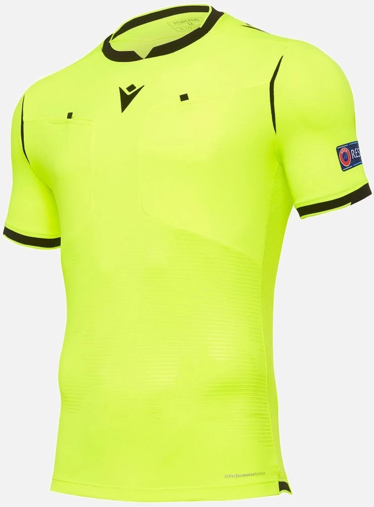 Macron Fußball Schiedsrichter Kurzarm Trikot UEFA Euro 2020 für Herren. Eine überzeugende Mischung aus Design und Sorgfalt im Detail prägt das neue Schiedsrichtertrikot von Macron für die UEFA. Außer den Mesh-Einsätzen besteht jeder Teil des Trikots aus verschiedenen Geweben, so dass ein vielfältiges Design entsteht: weiches Jacquard-Gewebe im Nadelstreifenmuster vorn in der Mitte, Softlock an den Ärmeln, den vorderen Taschen und der Rückseite. Eine geprägte Europa-Grafik sticht auf der Brust hervor, während die Rückseite den Transfer UEFA FOUNDATION FOR CHILDREN zeigt. Auf der linken Seite fällt die Aufschrift ‚Respect‘ auf, der Slogan der UEFA-Kampagne gegen Rassendiskrimination, während auf dem rechten Arm der offizielle Aufnäher der UEFA EURO 2020 zu sehen ist. Material: 100% Polyester. Farbe: neon gelb/schwarz.