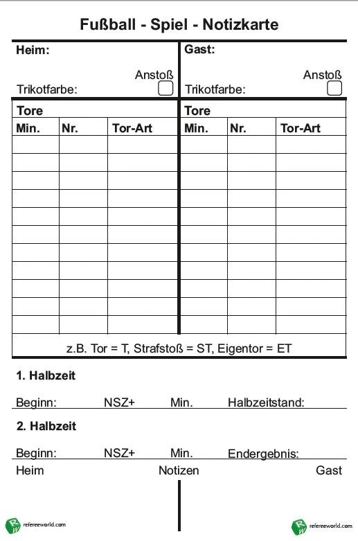 RW Fußball Schiedsrichter Spielnotizkarten DFB Onlinespielbericht 50 St. Disziplinarkarte. Spielnotizkarte ONLINE 50er Set. Unverzichtbar für eine sichere Spielleitung. Beidseitig vorgedruckter Schreibkarton mit speziell abgerundeten Ecken. Ohne jede Unterlage beschreibbar, 12 x 8 cm. Die Spielnotizkarte ist dem Onlinespielbericht angepasst. NEU: Jetzt sind auch die Disziplinarmaßnahmen für Trainer/Betreuer berücksichtigt. Material: Karton. Farbe: weiß/rot/gelb.